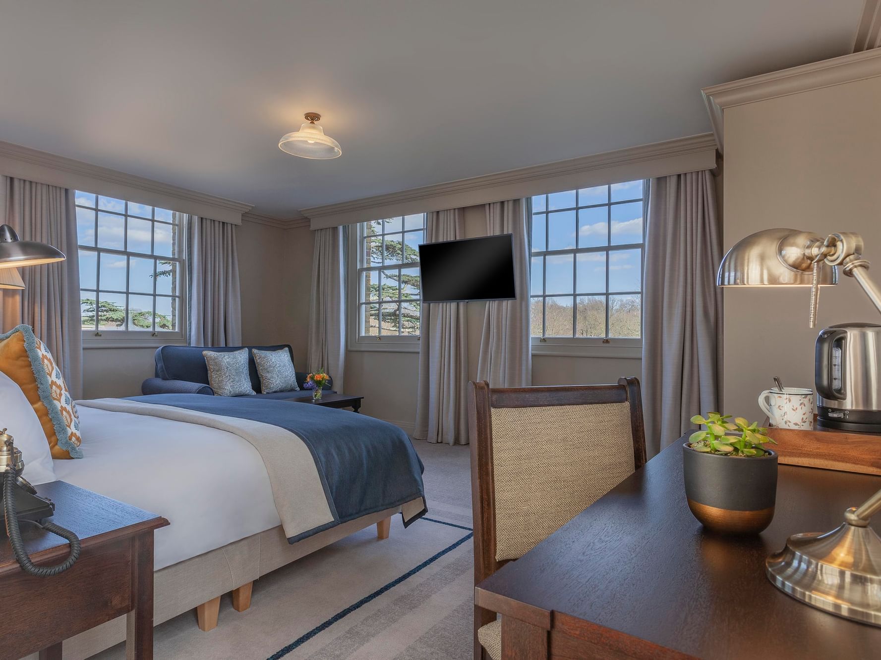 Slightly larger than the Double, these rooms incorporate the addition of the elegant Treviso desk designed by Mathew Hilton framed by the large modern bay window.